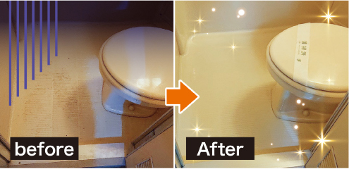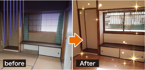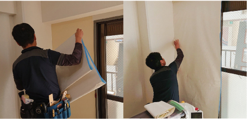 日焼けによる黄ばみや、テレビや冷蔵庫といった家電を置いたことによってできた黒ずみ・凹み等、傷んでしまったクロスやクッションフロアを貼り替えます。